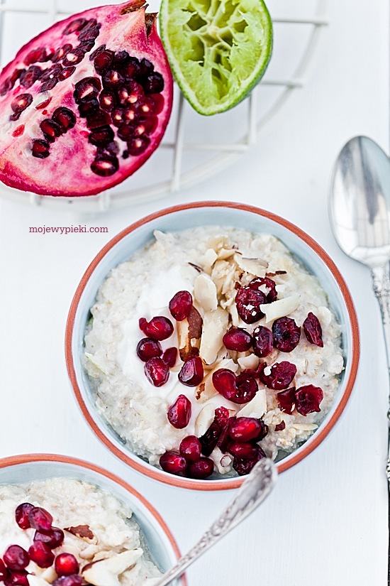 The next morning, remove from the fridge and add the lime juice, grated apple, yoghurt (I often add a bit more, depending on the oats), and agave syrup. Mix well. Spoon into bowls and top with dried cranberries, pistachios (or other nuts), and pomegranate seeds. Serve immediately.