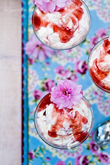 Whip the cream until stiff peaks form. Gradually fold in the rhubarb purée and syrup, gently mixing to create a marbled effect. Spoon into serving glasses and serve.