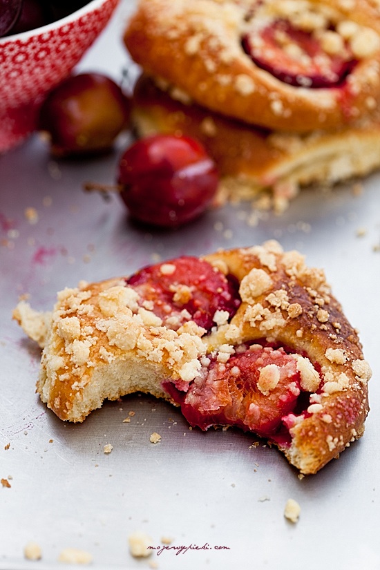 Wyrobione ciasto podzielić na 16 równych części. Uformować z nich kule, ułożyć na blaszce w sporych odległościach od siebie, lekko spłaszczyć. W każdą bułeczkę wcisnąć 2 połowy śliwki, rozcięciem ku górze. Przykryć folią spożywczą lub ręczniczkiem kuchennym, odstawić w ciepłe miejsce do podwojenia objętości, na około 1,5 – 2 godziny.