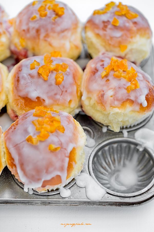 Przygotować formę do muffinek i wyłożyć papilotkami. Porcje ciasta nabierać łyżką (1 porcja około 55 g), lekko rozpłaszczyć w dłoni, do środka nałożyć 1 łyżeczkę nadzienia (ulubionego dżemu lub konfitury), zlepić i uformować kulki, odłożyć na stolnicę oprószoną mąką, a następnie przenieść do formy na muffinki. Przykryć lnianym ręczniczkiem kuchennym i pozostawić do wyrośnięcia w ciepłym miejscu, do podwojenia objętości.