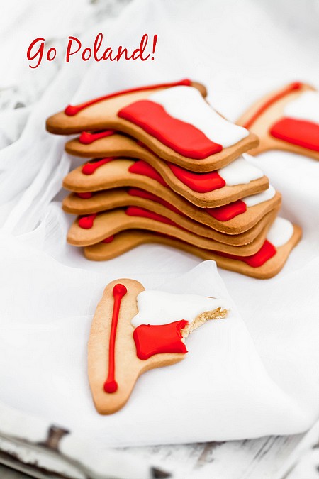 I tym razem na blogu musi być coś w barwach narodowych. Foremka na pewno przyda mi się jeszcze nie raz, choć polska flaga jest chyba jedną z prostszych do odtworzenia. Tradycyjne maślane ciasto kruche, z którego możecie także wykonać ciasteczka wyciskane z maszynki do ciastek. Jeśli nie macie foremki w kształcie flagi, można wycinać ciasteczka w kształcie np. serc lub prostokątów. Ciasteczka flagi są udekorowane lukrem królewskim, czyli sztywnym lukrem na bazie białka. I… pozostaje tylko trzymać kciuki i wiernie kibicować ;).