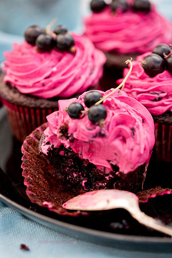 Mocno nadziane babeczki ;-). Głęboko porzeczkowy smak i czekolada to połączenie nie do odrzucenia. Zrobiłam z ostatnich czarnych porzeczek w tym sezonie, ale możecie je zrobić nawet w „grudniu po południu” z owoców mrożonych. Czekoladowe babeczki z czarną porzeczką są podwójnie porzeczkowe: oprócz widocznego kremu na górze nadziane są dżemem porzeczkowym w środku. Porzeczkowe szaleństwo!