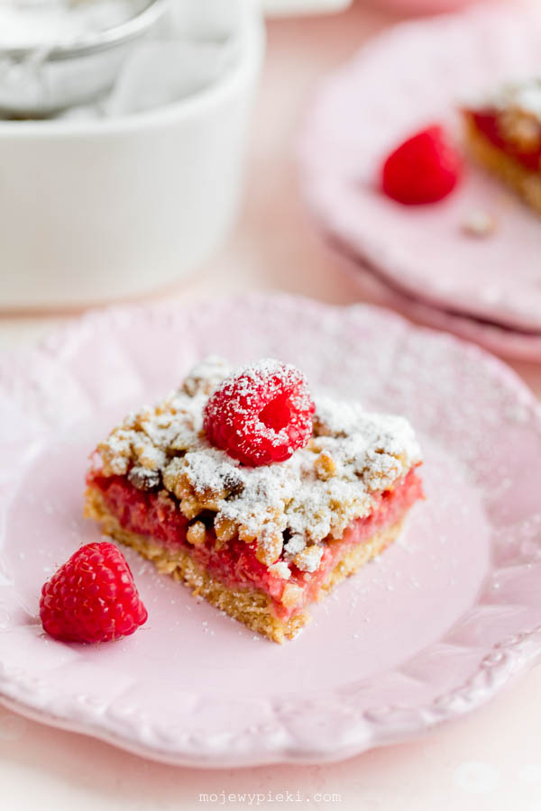 Niezwykły smak, niezwykła krajanka z malinami i orzeszkami pini. Brak mi słów, by powiedzieć, jaka jest pyszna. Kruchość i lekkość kruszonki z płatków owsianych, jeszcze ciepłe, pachnące maliny, mmm… Bardzo polecam!