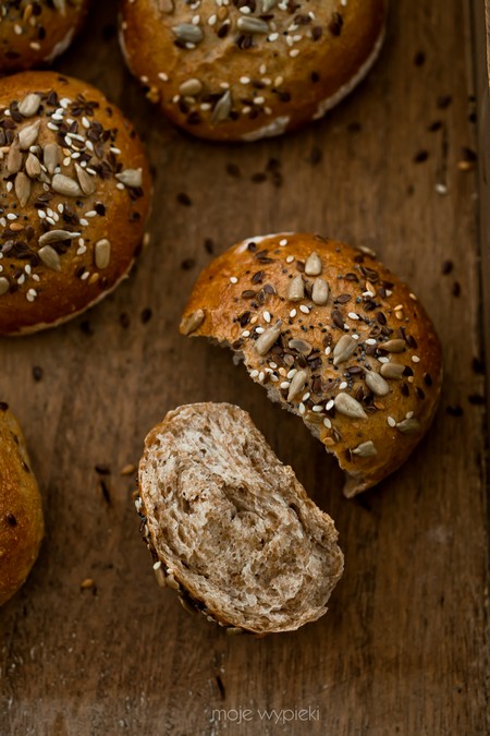 Delikatne, zdrowsze bułeczki, z dodatkiem mąki orkiszowej razowej, posypane ziarnami. Z niewielką ilością masła, bez jajek, posłodzone miodem. Jestem pewna, że Wam posmakują :-).