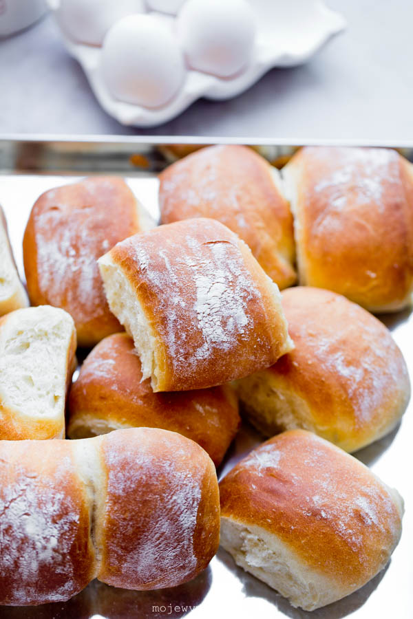 Wspaniałe bułki na zakwasie żytnim, które przygotowałam bez udziału drożdży. Ciasto oczywiście rośnie dłużej, ale dzięki dużej ilości zakwaszonego ciasta przebiega to szybciej niż w przypadku innego pieczywa na zakwasie. Nie są również trudne w wykonaniu; jeśli Wasz zakwas leżakuje w lodówce – teraz jest dobra pora by go wyjąć i dokarmić :-). Jeśli nigdy wcześniej nie nastawialiście domowego zakwasu – zapraszam po sprawdzony przepis. Bułki zostały przygotowane na 3 mąkach: żytnia razowa (zakwas), pszenna i pszenna razowa (w oryginale mąka graham, można też użyć mąki orkiszowej razowej). Przygotowanie ciasta należy zacząć wieczór wcześniej i, jak w przypadku innego pieczywa na zakwasie, sporą rolę odgrywa tutaj czas i Wasza cierpliwość :-). Bułeczki wspaniale rosną (ciepła pogoda sprzyja) a ich miąższ jest bardzo puszysty. Pieczemy je 'przytulone’, dzięki czemu dłużej zachowują świeżość. Posmakują Wam!