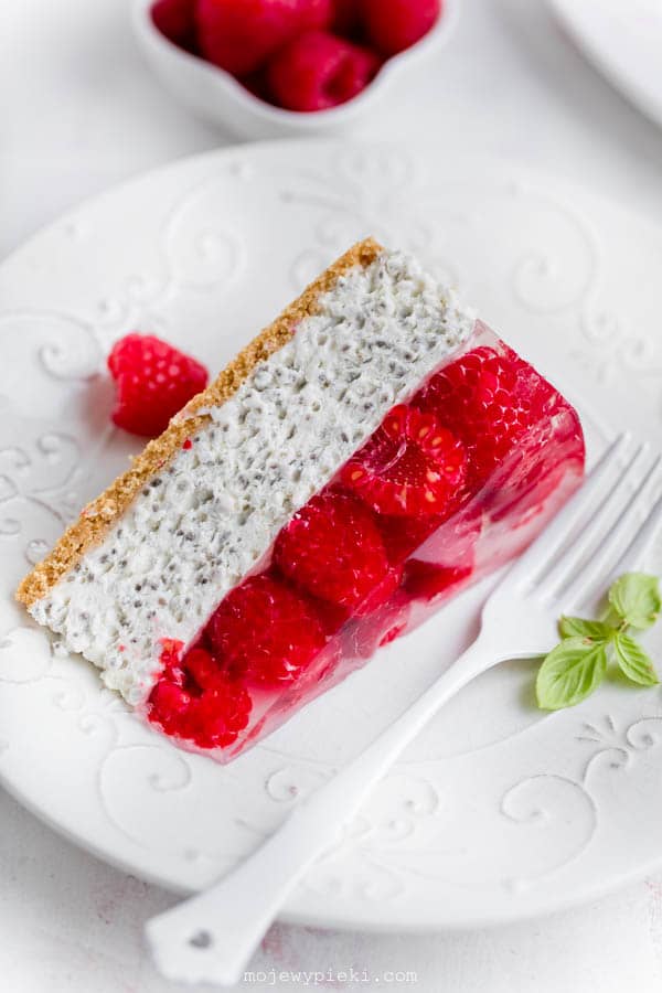 Sernik chia z malinami, który powstał na podstawie mojego ulubionego puddingu z nasionkami chia. Lekki sernik, bez pieczenia, na prostym spodzie ciasteczkowym i z dużą ilością świeżych malin. Nutą smakową w serniku chia z malinami jest delikatny aromat kokosowy, dlatego na wierzch zdecydowałam się wykorzystać przezroczystą galaretkę o smaku wody kokosowej. Bardzo polecam!
