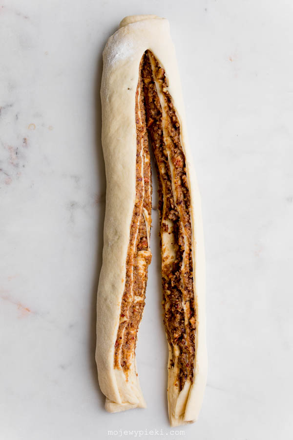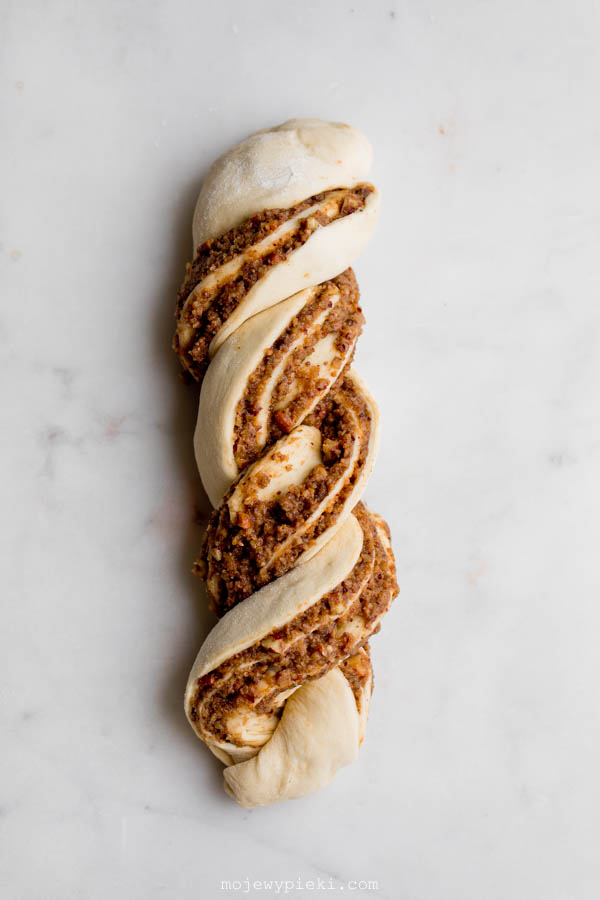 Każdy kawałek ciasta rozwałkować na prostokąt około 30 x 25 cm. Rozsmarować na nim jedną część nadzienia orzechowego i zwinąć na kształt rolady, lekko ją spłaszczyć. Ostrym nożem przeciąć roladę wzdłuż, zostawiając jeden z końców nieprzecięty, jak na zdjęciu. Spleść ciasto ze sobą, zlepić końcówki. Umieścić na blaszce wyłożonej wcześniej papierem do pieczenia, przykryć ręczniczkiem kuchennym i pozostawić w cieple do wyrośnięcia na około 40 – 50 minut lub do podwojenia objętości.