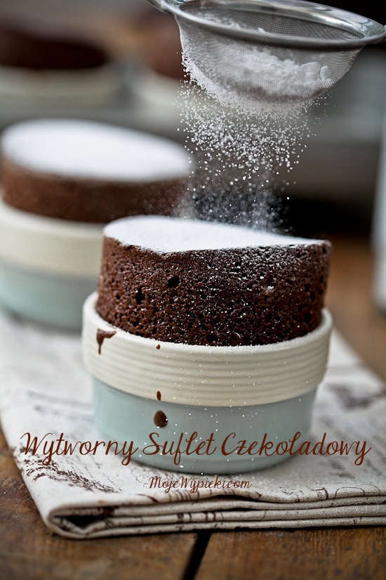 Gorące suflety wyjąć z piekarnika, oprószyć pudrem i natychmiast podawać. To naturalne, że po około 5 – 10 minutach suflety lekko opadną (dlatego zawsze podajemy natychmiast po wyjęciu z piekarnika). Wtedy wystają około 1 cm ponad ramekiny.