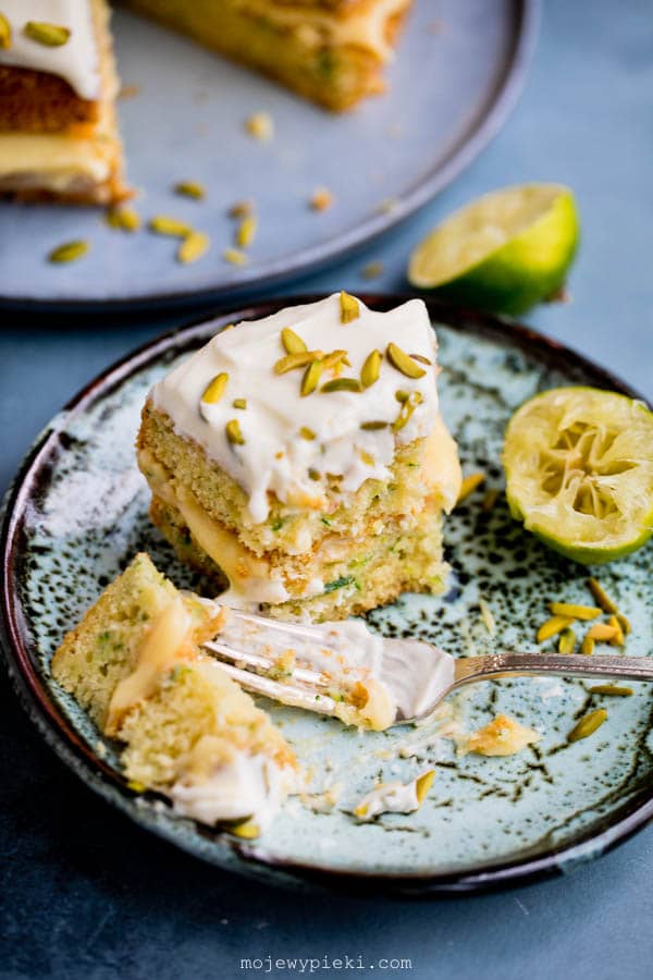 Torcik z cukinią i limonkowym kremem to ciasto z dodatkiem startej cukinii przełożone limonkowym curdem i posmarowane kremem z serka kremowego, oprószone pistacjami. Ciasto proste do wykonania (do czego przyzwyczaiła już nas autorka przepisu – Nigella Lawson), wspaniałe w smaku i wilgotne – jak większość ciast z dodatkiem cukinii. Bardzo rześkie, wręcz już wiosenne, zapewne za sprawą limonek. Zdecydowane warte Waszej uwagi i czasu mu poświęconego. Bardzo polecam!