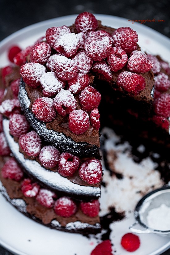 Pamiętacie brownie z majonezem? A gdyby tak cały tort..? W majonezie dodawanym do ciast nie ma nic nowego: to jajka i olej, czyli podstawowe składniki ciasta. Na pewno nie raz piekliście babkę majonezową :-). Majonez jest ważnym składnikiem ciasta – powinien być prawdziwy, delikatny w smaku, odpowiednio tłusty, nie 'light’. Tort czekoladowy upieczony z tego przepisu wychodzi lekki i mięsisty, czarny w przekroju. Jest wilgotny i długo utrzymuje świeżość. Tort upiekłam w trzech foremkach o różnych średnicach, ale można wybrać tylko jeden rozmiar i upiec tort o tradycyjnym kształcie. Przepis na ciasto jest prosty i nie wymaga użycia miksera, wystarczy rózga kuchenna. Tort przełożony jest pysznym kremem (musem) czekoladowym i świeżymi malinami. Z ciasta czekoladowego z majonezem piekłam również babeczki, to jedne ze smaczniejszych i prostszych, jakie próbowałam. Polecam na weekend, poezja smaku!